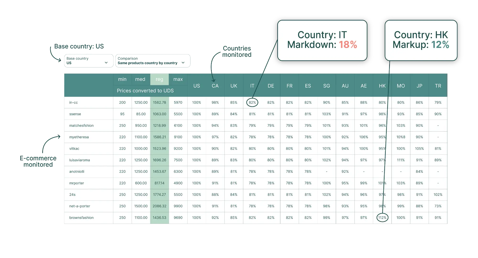 Brands and e-commerce sites with operations in multiple countries need to know the markdowns adopted in the single countries. With the Geopricing or GPS function, you can measure the average price difference percentage for common items in a specific country.
