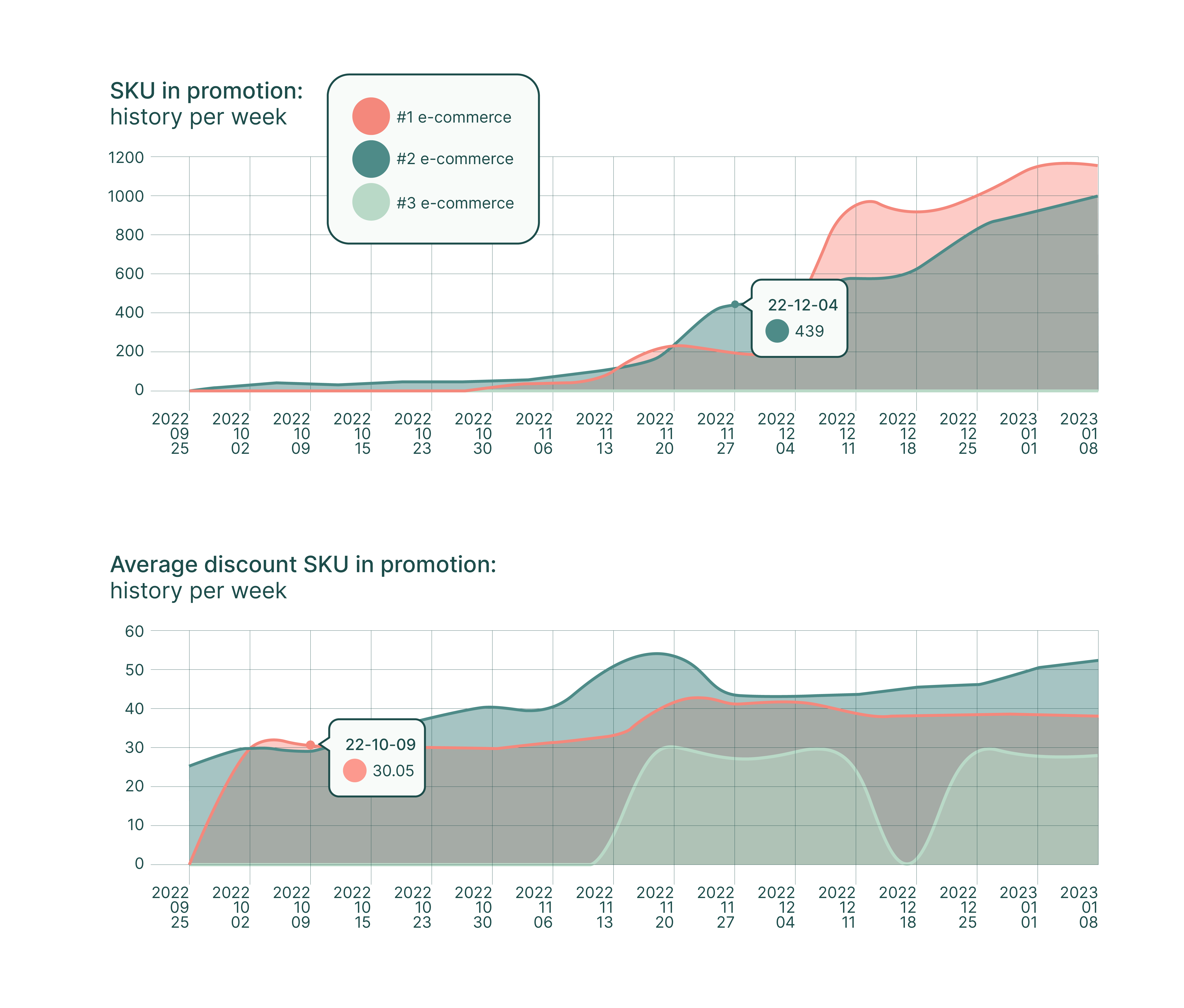 Promotional pressure affects sales as well as customers’ perceived value of brands. That’s why it’s important to constantly monitor the number of items on special offer and the discount percentage applied by e-commerce sites on the original price as well as on the brands’ suggested retail price. Storing the gathered data makes historical analysis of trends possible.
